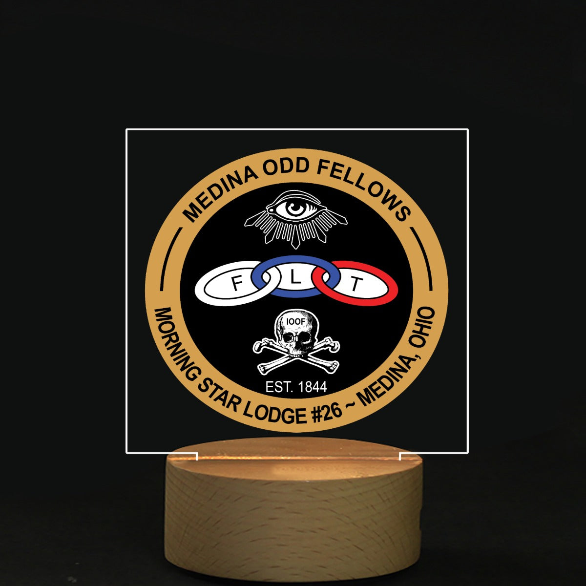 High quality acrylic board with wooden pedestal. You can press the button to shift LED color(7 colors to choose: red, green, light blue, dark blue, yellow, pink, white) and adjust the brightness.